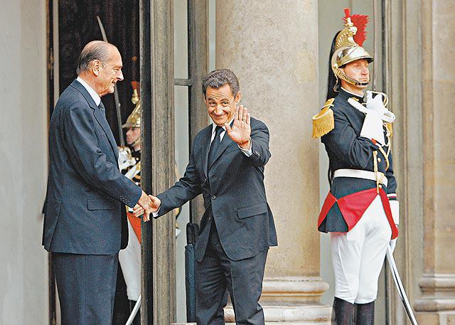 薩爾科齊在早上抵達愛麗榭宮,在檢閱共和國衞隊後,踏上紅地毯的階梯,與歡迎他的希拉克(JacquesChirac)緊緊握手,兩人隨即單獨會晤半小時,薩爾科齊聽取希拉克講述國家當前要務,並取得發射核彈密碼。