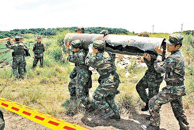 台灣「漢光二十三號」軍演,昨晨在宜蘭北嶺進行三軍聯合截擊操演,台軍出動F-16戰機群發射燃燒彈製造戰火場面,並在海上投擲500磅炸彈(圖一),轟炸目標。但在地面發射對空截擊導彈時,無論鷹式導彈、復仇者導彈、檞樹導彈都出現脫靶的情況。其中,復仇者連射兩枚均未中目標,檞樹則掉到海裏。而鷹式導彈雖向海邊發射,卻掉到蘇澳頂寮公墓草地上,軍方事後急急派人收回導彈的推進器(圖二)。 台灣《蘋果日報》/法新社