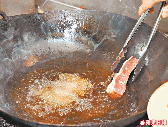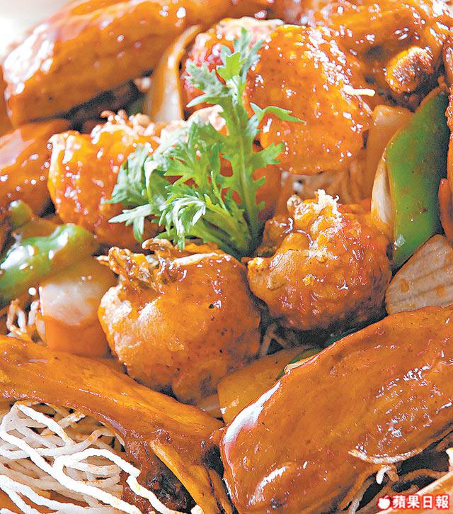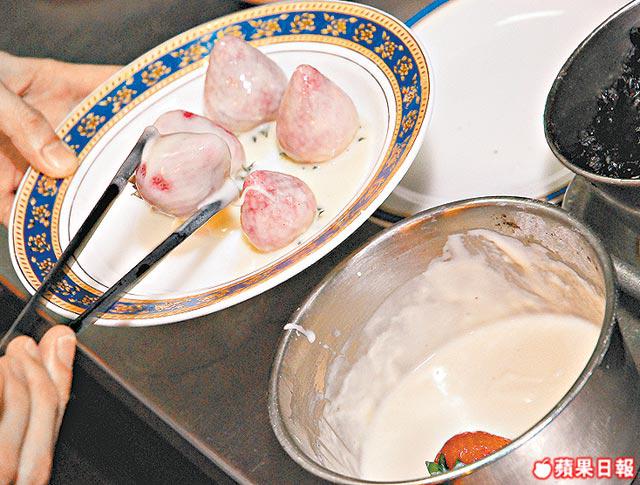 做法:豬肋骨先以鹽/糖/菠蘿粒醃2小時,放油鑊以慢火油浸15分鐘至熟,盛起備用;米粉放滾油炸1秒後撈起伴碟;士多啤梨蘸上炸漿炸至金黃撈起上碟;青/紅椒切粒炒熟,下糖醋汁煮熱,肋骨回鑊兜勻上碟。