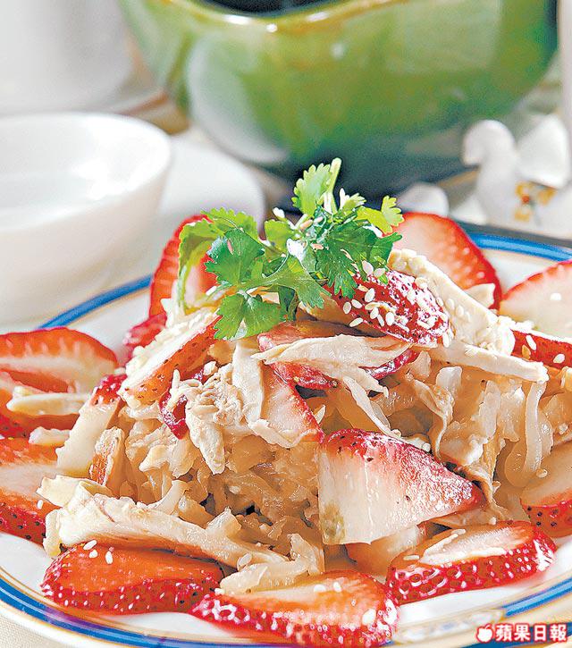 做法:鮮雞內外塗上粗鹽醃勻,蒸25分鐘後,手撕起出雞肉,包上保鮮紙冷凍約10至15分鐘,之後取出以海蜇/士多啤梨/麻醬拌勻享用。