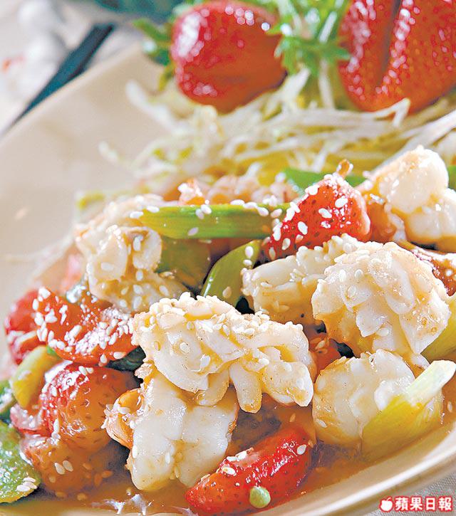 做法:中蝦去殼挑腸,上生粉再沖水;將鮮魷/中蝦走油撈起備用;爆香薑片,下蜜豆/紅蘿蔔片炒3分鐘,鮮魷/中蝦回鑊兜勻,下調味及士多啤梨略兜上碟。
