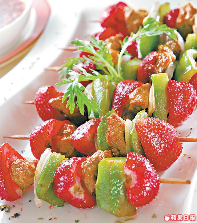 做法:牛柳以鹽/糖/胡椒粉/麻油/生油醃30分鐘,然後以大火炸約30秒撈起備用;將青椒/洋葱切方形,與牛柳/士多啤梨相間串起,放焗爐以120℃焗5分鐘即成。