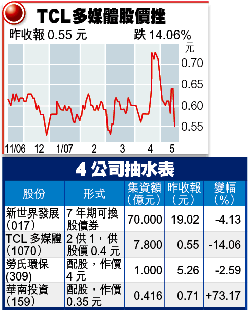 股市暢旺及市場資金氾濫,吸引二、三線上市公司不斷「抽水」。TCL多媒體(1070)供股集資7.8億元、勞氏環保(309)及華南投資(159)則透過配股共集資1.4億元,3間公司合共「抽水」9.2億元。通常上市公司配股後,股價都會受壓,但華南投資卻急漲73%,一反常態。