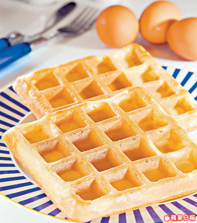 做法:亁料即麵粉/糖/發粉/鹽篩入碗內備用;分開蛋黃和蛋白,然後發打蛋白;把蛋黃/植物油/奶同時間加入亁料內,並發打至無凝固物;加入蛋白後,用烘烤機製成窩夫。