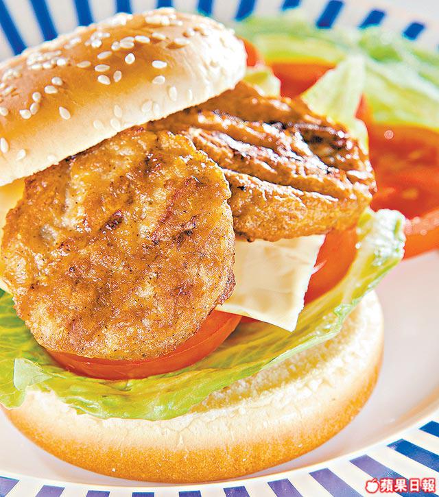 做法:用烘烤機把漢堡扒烘熟後,和其他材料一併夾入漢堡包即可。