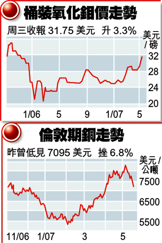 由於投資者憂慮銅在中國出現供應過剩,國際期銅連跌兩日,倫敦3個月期銅昨曾跌近7%,跌至六周低位,其他主要基本金屬亦跟隨下跌2.7%至7%不等;不過,稀有金屬鉬的價格走勢凌厲,一個月升了12.4%,周三更創下一年半新高。