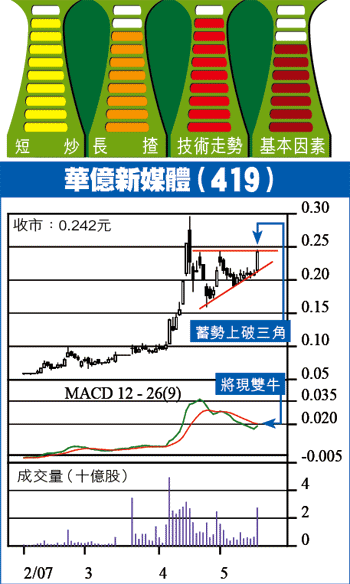 今日推介華億新媒體(419),升15.7%,排31位,喺整固個多月後,再出現爆炸性上升,成交更大增到27.2億股,係前日嘅4.6倍,股價已拋離10日線(0.209元)同20日線(0.206元),MACD亦會好快出現「雙牛」入貨訊號,新上升浪確認,短線可重上4月中的高位0.295元。