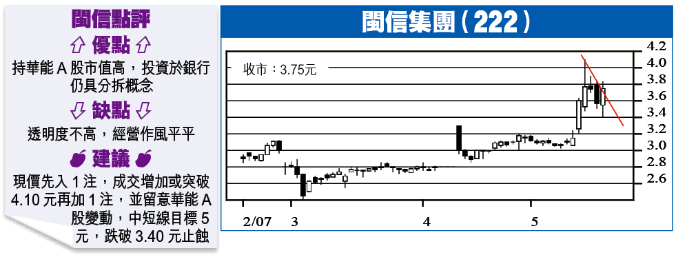 由此計算,閩信價值應為29.26億元,相當於每股6.37元,昨收3.75元,資產折讓41%,要注意的是華能是市值計,應計折讓,但出售後便是現金,理論上不必計折讓,儘管閩信經營作風平平,候低吸看中長線價值仍在。