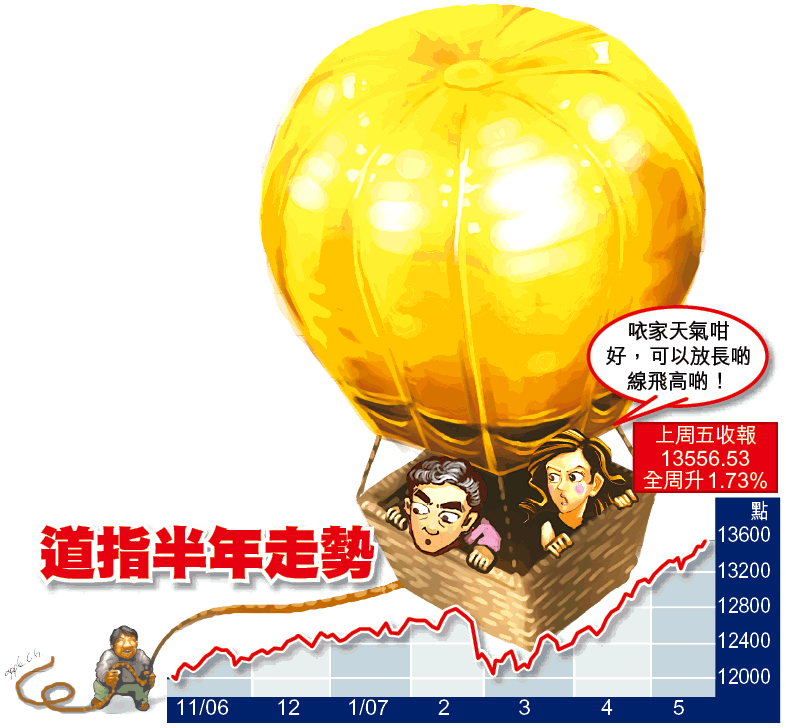 總結全周市況,道指累積升230點或1.73%,標普指數漲16點或1.12%,兩項指數都是連續第7周造好,為03年底至今最長升浪;納指上周則跌3點或0.15%,是連續第二星期低收。本月以來,道指有9日創下歷史高峯,是01年至今最佳的5月份表現。