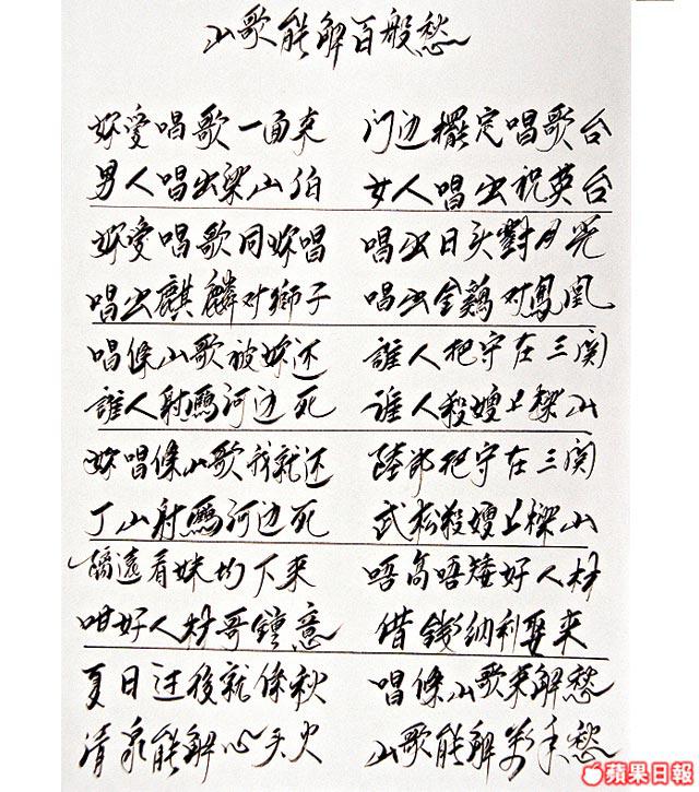 唱客家山歌非常了得,連老婆也是用山歌𠱁返嚟的馬遊塘村村長曾慶明指,其實全中國的漢族婚姻儀式都是來自「禮」的傳統,但客家人就確份外講究,例如客家茶粿一出,麒麟起舞,唱到天花亂墜的客家山歌贈興,則是百分百的客家標記,帶強烈農民色彩,新娘入門時要大步「檻過」燒紅了的犂頭,亦是別出心裁的一着,別人檻火盆來辟邪,客家人則語帶雙關,要從犂頭尖的一端檻過鈍的一頭,寓意男性陽具,功能生產作育、多生貴子。