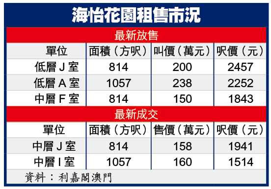 地址:氹仔史伯泰海軍將軍大馬路 推介單位:3座中層 面積:1000方呎 實用率:70% 間隔:3房 開價:180萬元 呎價:1800元 賣點:座落氹仔市中心,交通方便 資料:利嘉閣澳門南灣分行