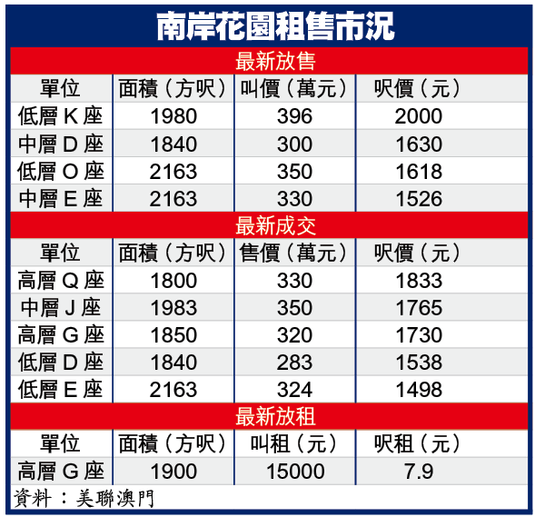 位於巴黎街樓齡約有12年的南岸花園,鄰近多個新建賭場,吸引不少於賭場上班人士進駐,租務及賣買交投俱見活躍。