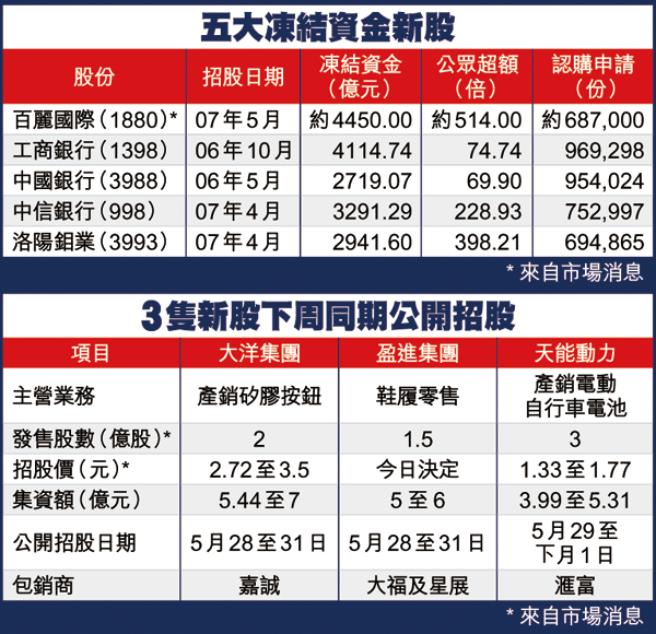 中國女裝鞋最大的零售商百麗國際(1880),公開招股凍結市場資金4450億元,成為「新股王」,是本港歷來凍結市場資金最多的新股。市場消息透露,散戶認購一手百麗的中籤率是25%,認購2萬股或20手才穩獲一手。百麗將於本周三(23日)掛牌。