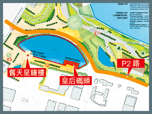 【本報訊】由建築師、規劃師等專業人士組成的「保育皇后碼頭古蹟專業關注組」表示,中環填海後,只要把地下去水管、P2路和機鐵掉頭隧道輕微改道,便可在皇后碼頭現址對開興建一個「人工湖」,屆時毋須清拆皇后碼頭,更可重置舊天星鐘樓。