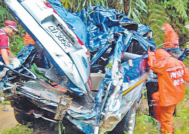 台灣南投縣竹山鎮昨日下午4時許,一輛旅遊小巴跌落山谷,造成4死5傷慘劇。肇事的小巴,屬無牌經營載客服務,出事時載着新莊市一戶姓陳的一家祖孫八口,正沿地勢險峻的狹窄山路開往太極峽谷頂的「天梯」吊橋遊覽,疑因天雨路滑跣胎,衝落山谷。