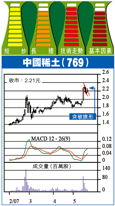 中國稀土(769)上周二大幅抽升,突破2.10元的頂部阻力,衝上2.36元後調整,可視為係突破形態的後抽整固,形成旗形,噚日升勢再起,收2.21元,進賬6仙,調整應已完成,再破位而上,第1個目標係2.60元,中線更可見3字頭。