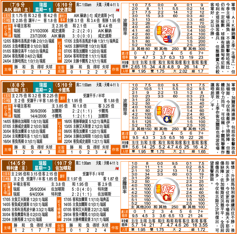 以佐加頓斯上盤作過關膽,冷腳方面,先捧AIK蘇納主場小勝;AIK屬上季「主場王」,不過今季稍為失色,主場3戰只得1勝2負。但細看所負對手,希爾星堡和卡爾馬俱屬中上游級數;相反咸史達斯完全靠主場搶分,作客明顯較弱,不過AIK有基斯甸希尼斯、哈利史堤芬遜等傷兵,博主隊小勝一球,開「讓球主客和」「和局」。加爾斯主場對卡爾馬,雙方均防守為先,各取一分合理,取3.2倍和局。