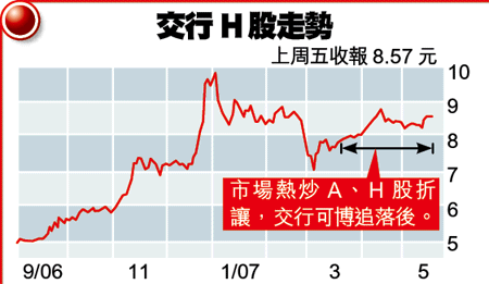 舉個例,交行自年初9.8元高位急速下調至7元,似乎失去上升動力,直至3月初才見底回升。交行去年純利增長33%,符合預期,正因沒有招行的亮麗業績,故其股價由高位回落。此外,交行及招行的貸存比率較高,兩者均約70%,相信是次宏調對其影響則較小。