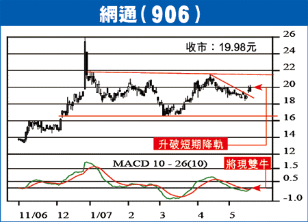 電訊股論現金收入豐厚,當然是中移動(941)為首選,但買中移動要顧慮期指大戶部署,以值博率計中國網通(906)或會更佳。網通去年底傳出重組消息,股價單日急升超過3成,但其後瞬即回落至20元水平,過去5個月,股價在16.6元至21.5元之間上落。上周四網通股價裂口升穿降軌及重上保歷加通道中軸,今日如續升,將可撐開保歷加通道發出單邊升浪訊號,而MACD亦剛現牛差距,日內有機會發出雙牛訊號。