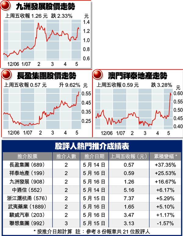 在芸芸股評人推介的股票當中,以炒收購內地銅礦的長盈集團(689)升幅最為顯著。長盈從事有色金屬採購及供應,市場憧憬長盈在未來三周內,將落實收購及重組一個國內的銅礦資產項目,更計劃將業務範圍擴展至鋁及鋅,未來盈利增長大有潛力,故自推介日起計,股價急升37.4%。