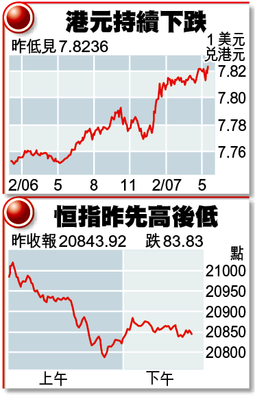 【本報訊】A股及人民幣滙價齊創新高,港股及港滙昨卻走軟。由於認購百麗(1880)的資金解凍,港元拆息昨天開始回落,有市場交易員表示,港息回落吸引了美元套息盤,港元滙價昨低見7.8236,較4月底時的7.8222水平略低,亦是近22年以來的低位。