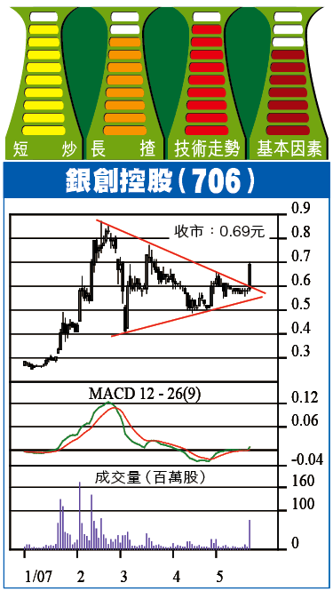銀創控股(706)消息好勁,話會在海外進行大型併購,配合現時在內地大力推行的自動櫃員機服務(ATM),令發展步伐可以更快速。銀創收0.69元,升11仙,短線可挑戰2月高位0.87元。