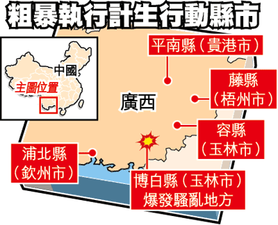 「比1937年日本鬼子進村還可怕!很恐怖,沒人敢上班、出街,現在是人心惶惶。」廣西博白縣由17日至前日,爆發七個鎮逾五萬人,反對當地政府強暴執行計劃生育政策的大騷亂後,據當地村民稱,當局昨日展開大規模秋後算賬行動,全縣動用3,000名武警公安搜捕帶頭騷亂和縱火燒毀鎮政府的人士;公安部門亦下令任何人士試圖衝擊鎮政府,武警即可開槍鎮壓;旺茂鎮更全鎮戒嚴,氣氛相當緊張。