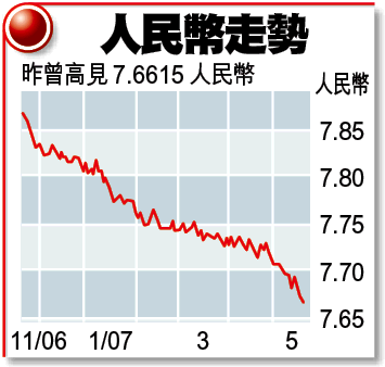 【本報訊】人民幣滙價在內地加息及擴闊波幅後的首個交易日表現強勁,開市中間價報7.6652,較上周五上升152點子,再創滙改新高。雖然滙率波幅擴闊至0.5%,但昨天人民幣滙率上下波幅僅73點子,相對中間價而言只升了0.095%。人民幣滙價昨最高曾見7.6615,收市時回至7.6673,仍較上周五高出13點子,創收市新高。