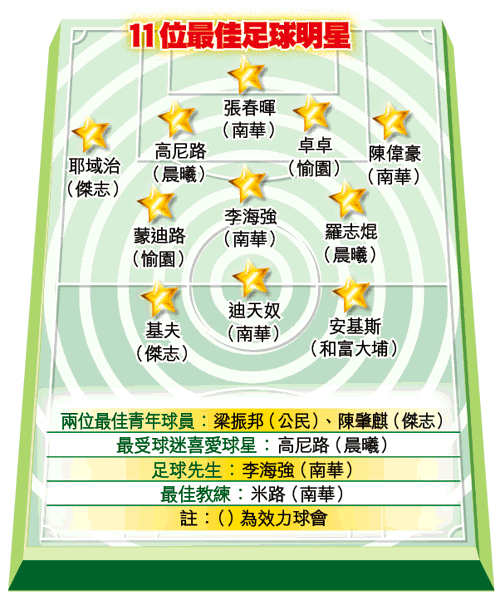 除李海強外,南華亦有廸天奴、陳偉豪及張春暉3人入選最佳足球明星,其餘7人包括晨曦的高尼路及羅志焜、傑志基夫及耶域治、愉園卓卓及蒙廸路,以及和富大埔前鋒安基斯。另外,最佳教練由季中加盟南華的米路當選。兩名入選的足球明星卓卓及蒙廸路,因代表愉園角逐亞洲足協盃而未有出席頒獎禮。已連續7屆當選、並打破歷來紀錄的卓卓,透過錄影片段向嘉賓們講得獎感受:「得到這個獎項,我要多謝全隊支持,畢竟足球是團體運動。」