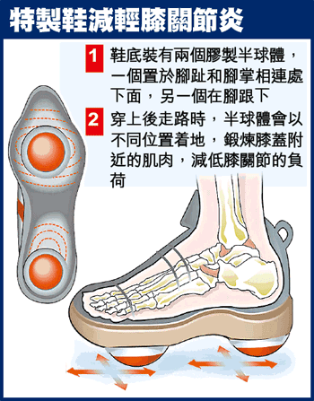 現在,以色列專家設計的「膝蓋關節炎暴走鞋」,最大優點是令患者不知不覺中接受了治療。鞋底兩個膠造半球體,令患者走路時,像穿上滾軸溜冰鞋一樣,正好訓練膝蓋附近的肌肉。