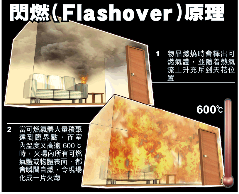 內的有機物料會因火勢而分解出可燃性物質,過程中所產生的熱氣體,會向上升至天花再向平面擴散。理工大學消防工程研究中心主任周允基補充,若這種熱輻射通量高達20kw/m2,加上火場溫度超過600℃,被分解出來的可燃性物質在得到足夠的熱量時便會燃燒,令現場每一寸空間,在一瞬間全部被烈火包圍。