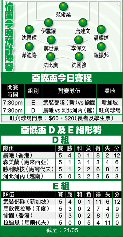 亞洲足協盃分組賽今日進行最後一輪賽事,香港兩支代表愉園及晨曦命運截然不同;前者作客新加坡武裝部隊必須大勝4球或以上,才能以最佳次名取得8強一席;相反提早出線的晨曦,主場迎戰越南的河北河內名副其實是一場風流波。