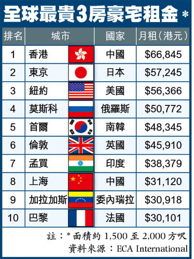 國際人力資源顧問公司ECAInternational過去10年跟進世界各城市租金變化,並於去年第四季比較全球92個城市,包括香港、東京、首爾、紐約、上海等地三房豪宅(面積約1,500至2,000方呎)租金,發現香港豪宅單位租金平均月租近6.7萬港元,連續兩年高踞全球三房豪宅租金首位。