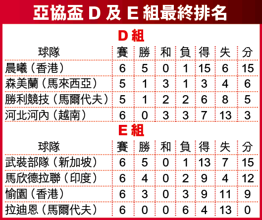 【本報訊】兩支角逐亞協盃的香港代表昨日命運迥異,穩奪8強席位的晨曦,在旺角場大踢風流波,並以7:4狂炒河北河內。至於遠赴獅城的愉園則先勝後敗,作客武裝部隊輸1:2,緣盡今屆亞協盃。