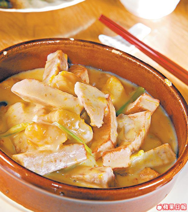 做法:芋頭/南瓜走油,加入8飯碗水/鹽、糖各1茶匙/生抽1湯匙燜3至4分鐘備用。椰汁/花奶/鹽、糖各1茶匙/生抽1湯匙/3飯碗水煮滾,下素煙鴨/芋頭/南瓜燜2至3分鐘,最後以豆粉埋芡即成。