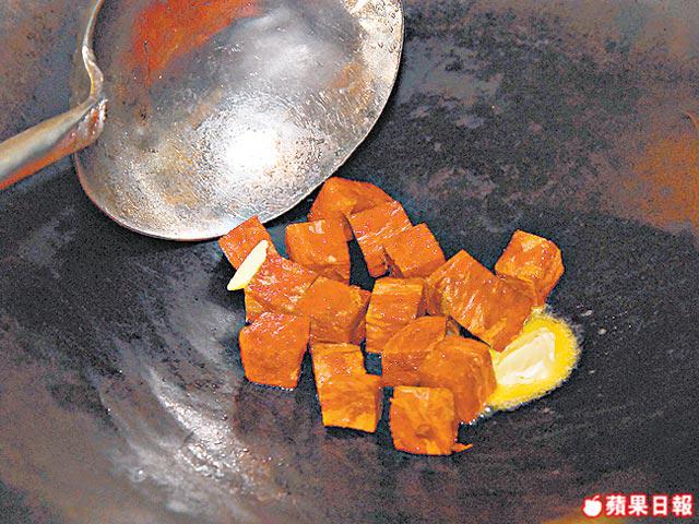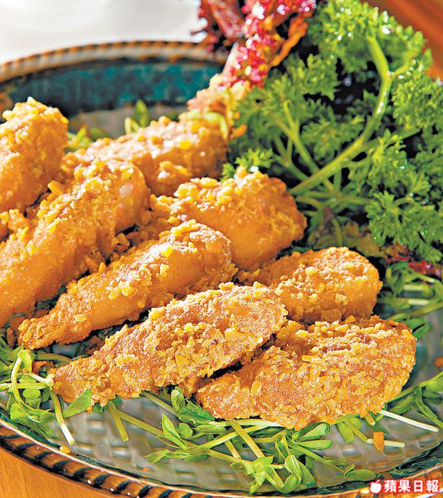 做法:素蟹箝蘸麵包糠慢火炸、浸5分鐘至黃金,撈起瀝油;鹹蛋黃蒸熟,放入焗爐以細火焗10至15分鐘至亁身,然後壓碎;爆香植物牛油,下鹹蛋黃煮勻,蟹箝回鑊兜勻即可。