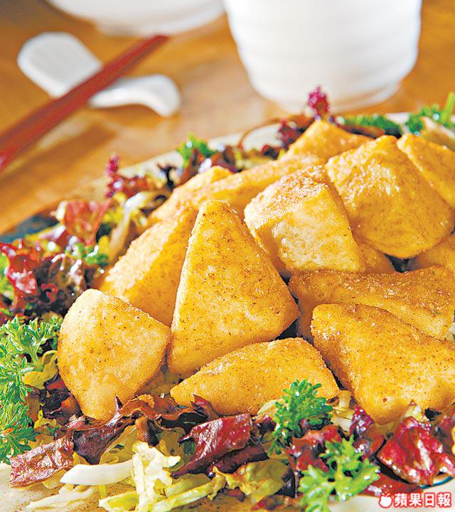 做法:豆腐切件,以鹽水浸5至10分鐘,瀝亁,蘸上薯粉/生粉,放猛火油鑊炸3分鐘至金黃,撈起瀝油,撒上辣椒粉即可。