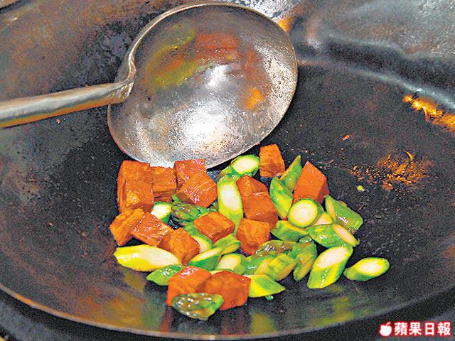 做法:先將蘆笋加鹽汆水備用;素牛柳切粒,以生抽/鹽/老抽醃5至10分鐘;爆香植物牛油,煎香素扒粒,蘆笋回鑊兜勻即可。