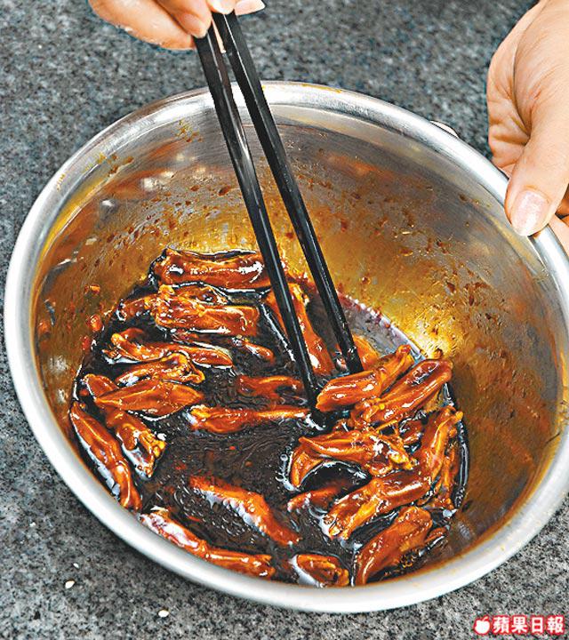做法:鴨舌先用刷刷淨,用水沖洗後瀝亁。醬汁拌勻煮滾,之後放入鴨舌煮5至10分鐘,取出鴨舌待涼,醬汁備用。豆瓣醬/半份醬汁拌勻後,浸鴨舌20分鐘後隔去汁料,放入雪櫃。吃時可加麻油。
