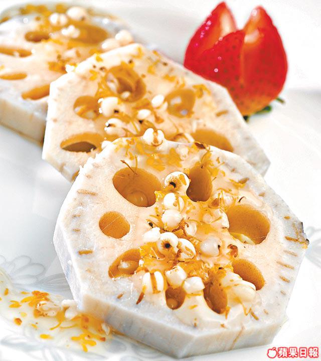 做法:蓮藕拌入冰糖/1碗水,隔水蒸45分鐘,蓮藕待涼後切片,蓮藕汁備用。薏米隔水,加蓮藕汁/半碗水煮30分鐘,加入桂花糖/生粉水煮滾成汁料,待涼後放入雪櫃雪凍。食時將汁料淋上蓮藕片便成。