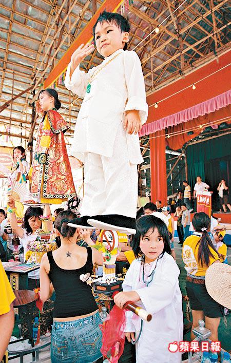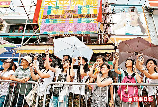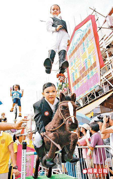 【本報訊】「李國章」及「羅范椒芬」昨日於長洲飄色巡遊上碰頭,再度上演「教院風波」,繫上領帶及袋巾的「李國章」一副大帝出巡的模樣,逗得在場人士歡天喜地;同場又重現「風之后」李麗珊摘金凱旋回歸;祝願明年奧運馬術成功等十二個不同主題。市民在烈日下汗流浹背觀看巡遊隊伍表演依然津津有味。