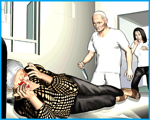 疑兇聞言後返回自己房間,未幾手持一把長生果刀衝入老婦房間,向她頭臉狂插多刀襲擊。老婦血流披面,其中右眼重創恐會失明,呼救聲驚動一名留宿女看護入內查看,赫見女事主受傷而疑兇持刀在手,嚇得逃往隔鄰E室單位報警。