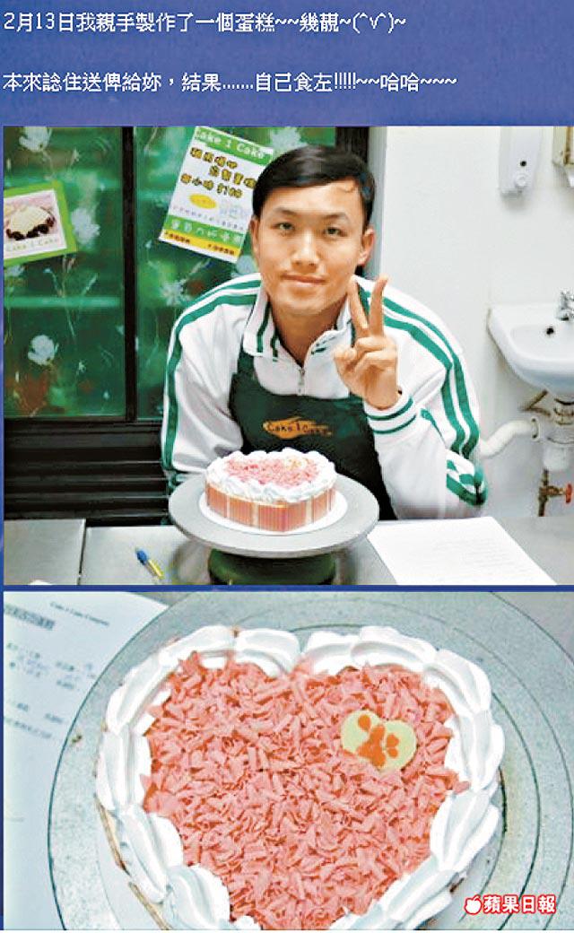 家熙的網誌貼了一張自製愛心蛋糕的照片,他稱是今年2月13日情人節前夕炮製的。大男孩高舉勝利手勢,是一個不簡單的朱古力蛋糕,純白的鮮忌廉加上心形花邊。「本來諗住送給妳,結果…自己食咗!哈哈!」KiKi的網誌也貼上這幀心形蛋糕的照片。