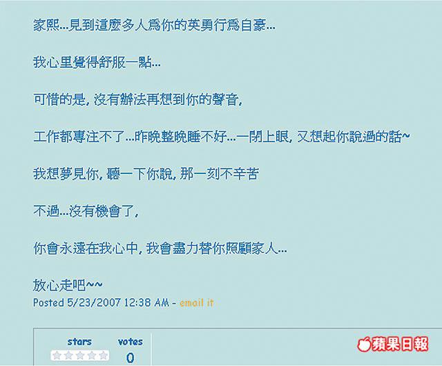 【本報訊】「曾經,有一個好人為我做了好多事,為我做蛋糕,為我開始了寫日記…他叫家熙」。俏佳人KiKi在網誌追憶的那位癡心漢,是前日在荃灣廠廈火場被閃燃烈火奪命的消防英雄黃家熙。曾痛錫自己的好人葬身火海,教KiKi肝腸寸斷,在網誌對這位曾被自己拒絕的人表白:「我想夢見你」。哀思、後悔、內疚,頃刻間湧上心頭:「要到失去了,才明白那個疼愛你的人有多重要」。家熙生前多位好友昨各自在網誌抒發愁懷。是友情,是愛情也好,最心痛是,愛得太遲。 記者:雷子樂 譚皚璧