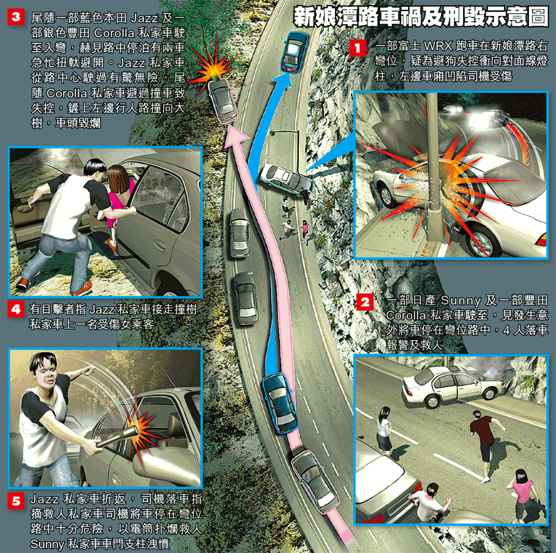 【本報訊】一部跑車昨凌晨在大埔新娘潭路彎位失事撞燈柱司機受傷,兩部私家車駛至停在彎位內,司機及乘客協助救人時,尾隨另外兩部私家車發現路中停有兩車急忙扭軚閃避,結果其中一車失控撞樹。目擊者指撞樹的車上一名女乘客受傷由同行私家車接走,未幾該同行私家車折返司機喝斥救人者,「你救人都block(封)咗條路先,咁樣好易俾你累死㗎!」並以電筒怒扑對方私家車洩憤被捕。記者:潘志能