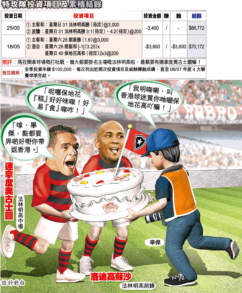 球迷都可以買「大」嘅;因為呢場話晒係里約熱內盧打吡,加上喺馬拉簡拿球場度踢,兩邊肯定搏盡。至於法林明高門將賓奴雖然高大有型,但把關技術一般,開「咧」戰就係俾彭美拉斯嘅艾蒙度,一記3樓咁高嘅「傳中罰球」笠死,要埋「大」啱㗎嘞。
