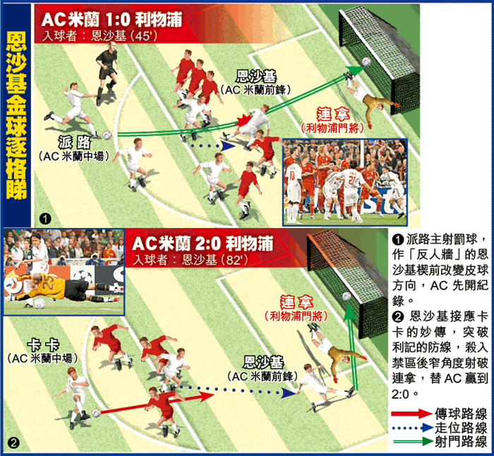 利物浦領隊賓尼廸斯賽後埋怨首個失球很倒楣,但恩沙基第2個入球卻清脆利落。出任單箭頭的恩沙基不斷在前場奔跑,每一次隊友的直線傳球,他都嘗試「偷步」但被哨聲喊停;直至82分鐘終,他接應卡卡的傳球突破越位,單刀推過連拿後巧射建功。