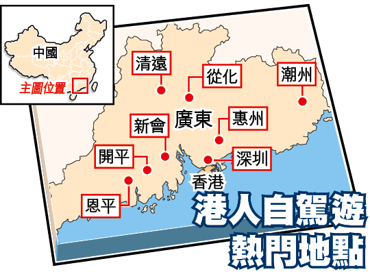 許多港人開始喜歡在廣東自己開車去到哪玩到哪的『自駕遊』旅遊方式。有香港公司有見及此,特別為喜歡自駕遊的港人推出租車服務,不用擔保人、銀行擔保或房產證擔保,只須付押金3,000元,另付租車費用,就可租車北上自駕遊。不過,方便之餘,港人也要小心,一要留意在內地開的是左軚車;二更要留意道路安全。有北上港人表示,在內地開車比在港開車危險得多,若真要的租車,寧願「包車」好了。