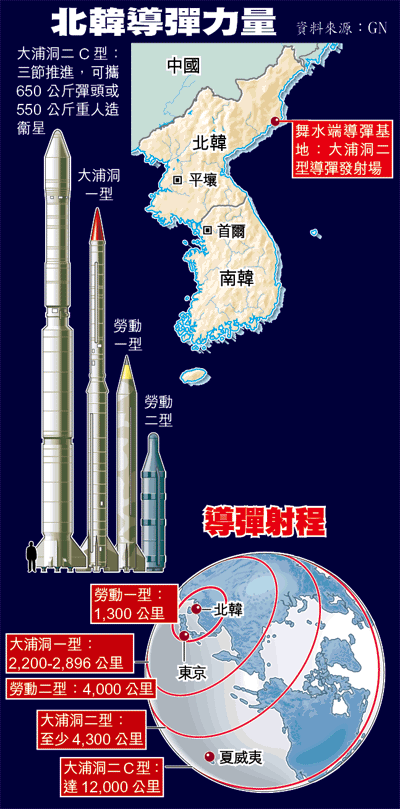 北韓的導彈技術主要來自前蘇聯和中國,在「飛毛腿」短程導彈的基礎上不斷加以改良,研製出「勞動」導彈和「大浦洞一型」中程導彈,但在發展射程可攻擊美國的「大浦洞二型」長程導彈卻連番受挫。西方情報官員透露,北韓近年與伊朗合作,伊朗以石油換取北韓導彈和核彈技術。