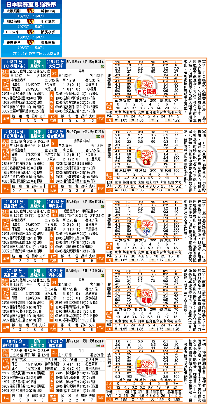 FC東京開始上力,周六在日職聯有力把近況低沉的名古屋八鯨擊退,「讓球」少讓平/半,上盤可捧;過關串神戶勝利船「讓球」平手贏柏雷素爾,以及廣島三箭對清水心跳和波收場。